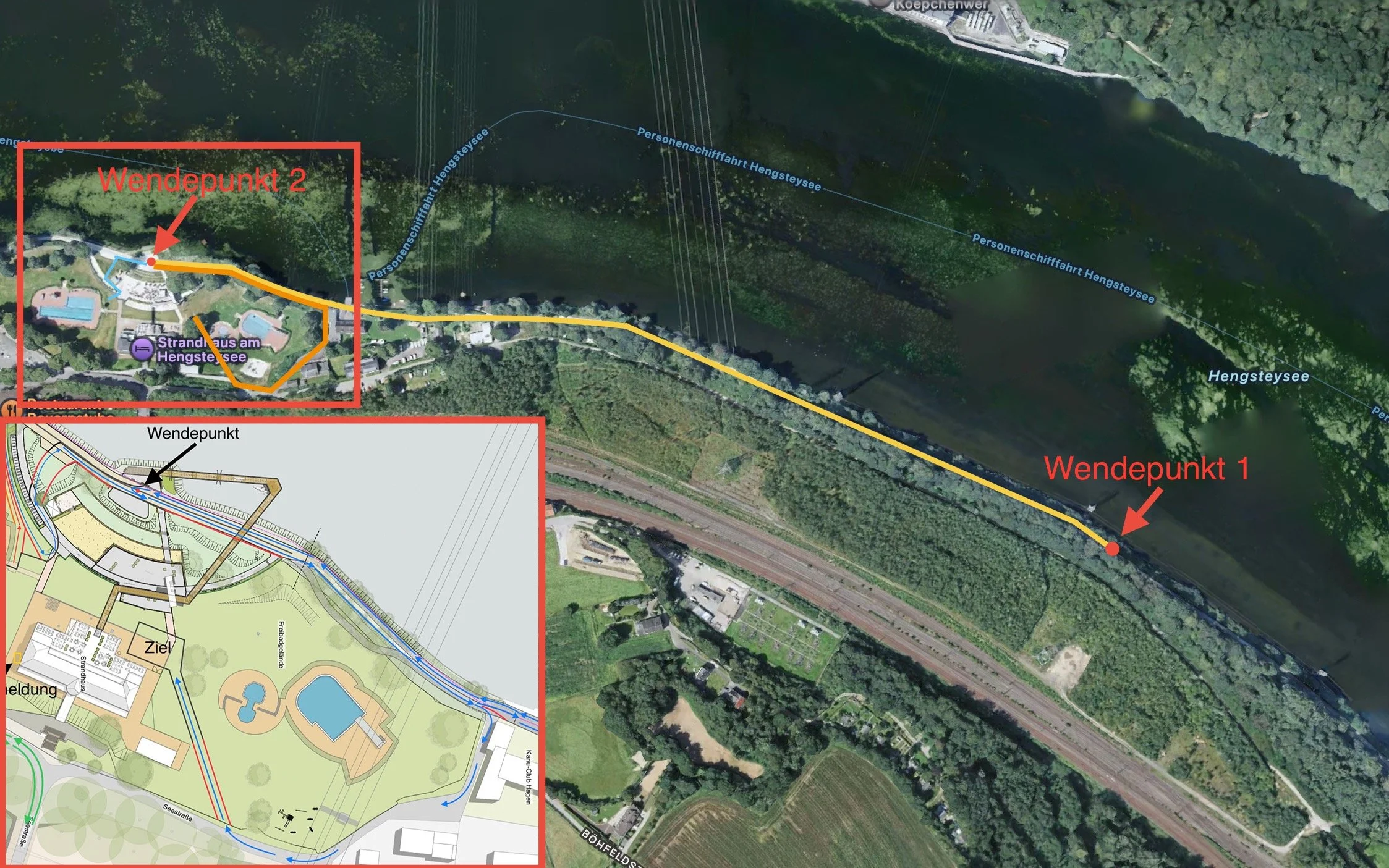 Gelaufen wird auf einer 2,5 km langen Wendepunktstrecke am Hengsteysee entlang. Wenn ihr aus der WZ kommt lauft ihr am 2. Wendepunkt vorbei bis ihr zum 1. Wendepunkt kommt, von hier geht es dann wieder zurück zum 2. Wendepunkt. Nach dem ihr den 2. Wendepunkt passiert habt geht es für Fun, Schüler A und Jungend B ins Ziel, Volksdistanz und Staffel laufen dann noch ein zweite Runde und Kurzdistanz dann noch 3 Runde. Schüler B haben eine eigen Wendepunkt für ihre 1 km Runde und Schüler C laufen auf direktem Weg in Ziel.