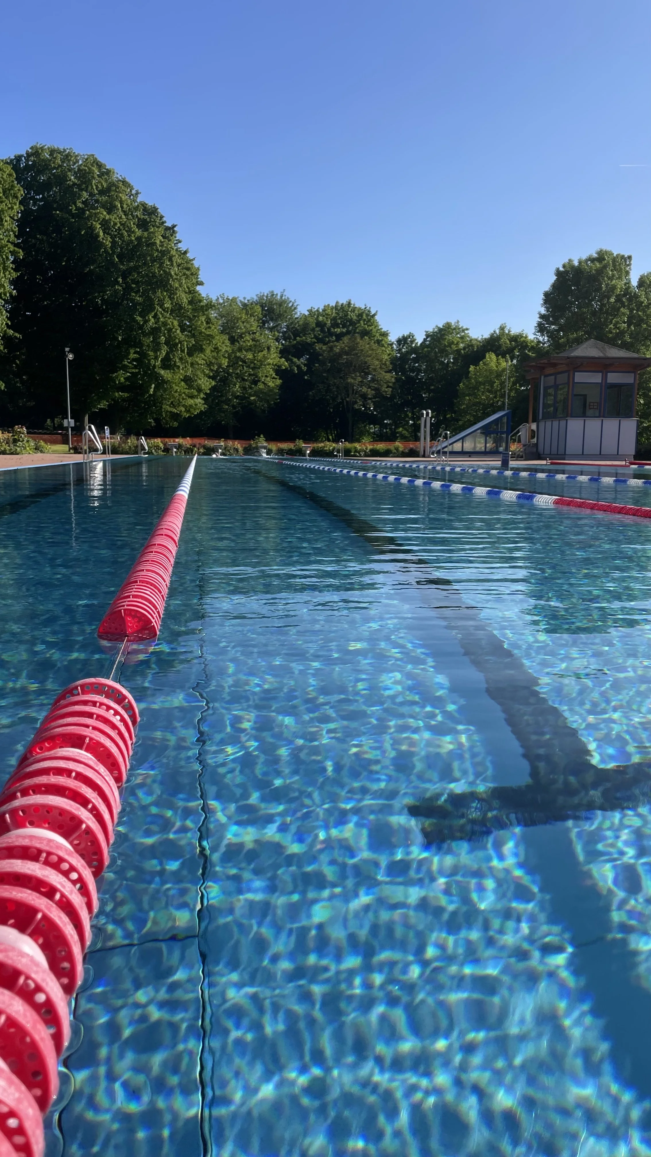 Das Freibad hat 25 Meter Bahnen und 50 Meter Bahnen, hier habt ihr die frei wähl ob 25 oder 50 Meter.